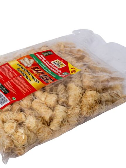 Produktbeschreibung „Ökologisch, brennt sofort an, flammt intensiv mit hoher Brenndauer.“ KM Kamin- und Grillanzünder, 2 Kg Beutel, Holzwolle mit Wachs,