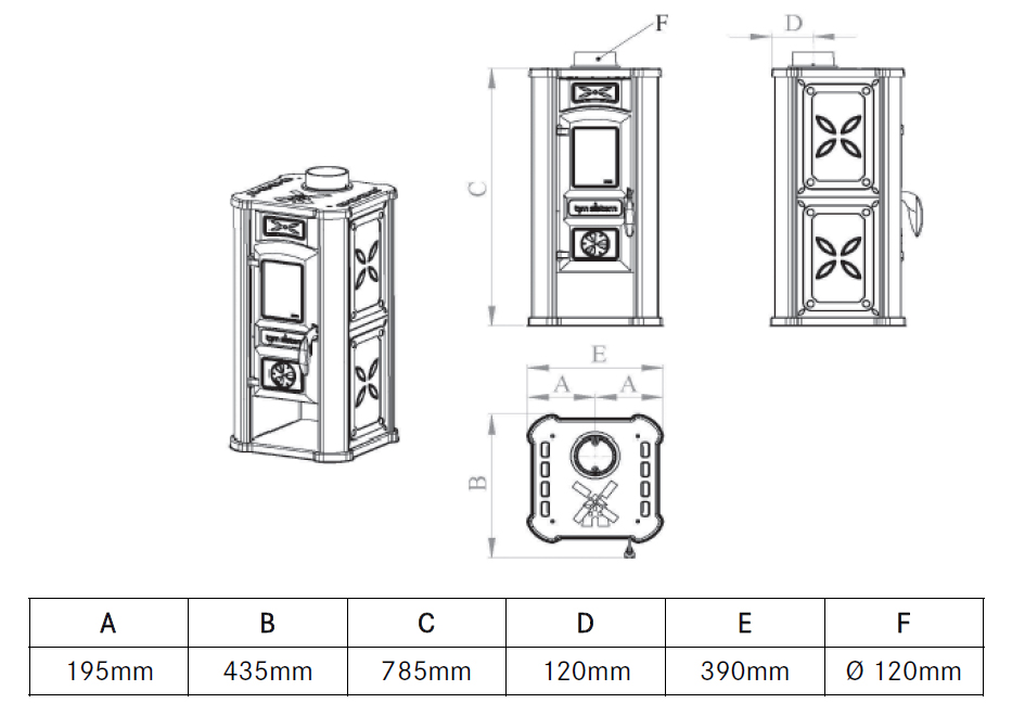 • Mindestabstand zu brennbaren Bauteilen: 35cm nach hinten, 35cm zur Seite, 80cm nach vorn