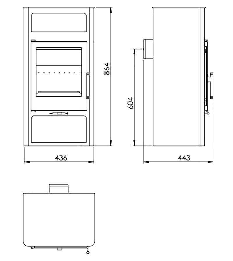 - 120 mm Rohranschluss nach hinten. Falls gewünscht kann das Ofenrohr somit direkt nach hinten in den Schornstein geführt werden, sodass man es im Raum nicht sieht.