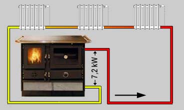 • Bei Nennwärmeleistung werden 10kW an das Wasser des Heizungssystems abgegeben und 4kW in Form von erwärmter Luft und Strahlungswärme in den Raum.