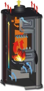 Der Friedrich mit Sandstein erwärmt den Raum sowohl durch direkte Strahlungswärme als auch durch einen Warmluftstrom. Unten im Ofen wird Luft in die Konvektionsluftschächte eingesaugt. Die Luft strömt an der heißen Verkleidung des Feuerraums sowie an diversen Wärmeableitblechen vorbei und wird erhitzt. Der warme Luftstrom steigt empor und strömt oben aus den Schlitzen heraus in den Wohnraum. Die Kombination aus Konvektions- und Strahlungswärme schafft ein angenehmes Raumklima. Die bei der Verbrennung freigesetzte Wärme wird optimal in den Raum abgegeben anstatt durch den Schornstein nach draußen zu verschwinden.